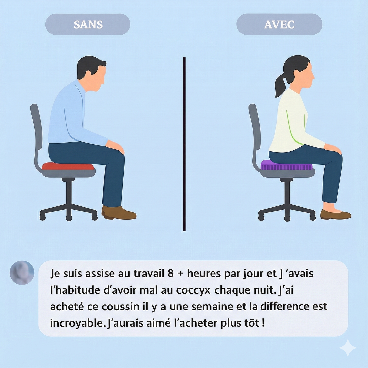 Ce n'est pas un gadget, c'est de la physique. La structure nid d'abeille utilise le principe du "flambage" : les alvéoles s'effondrent sous la pression pour créer des puits de décompression. C'est la même technologie que les sièges médicaux haut de gamme. 94% de nos clients ressentent un soulagement immédiat.