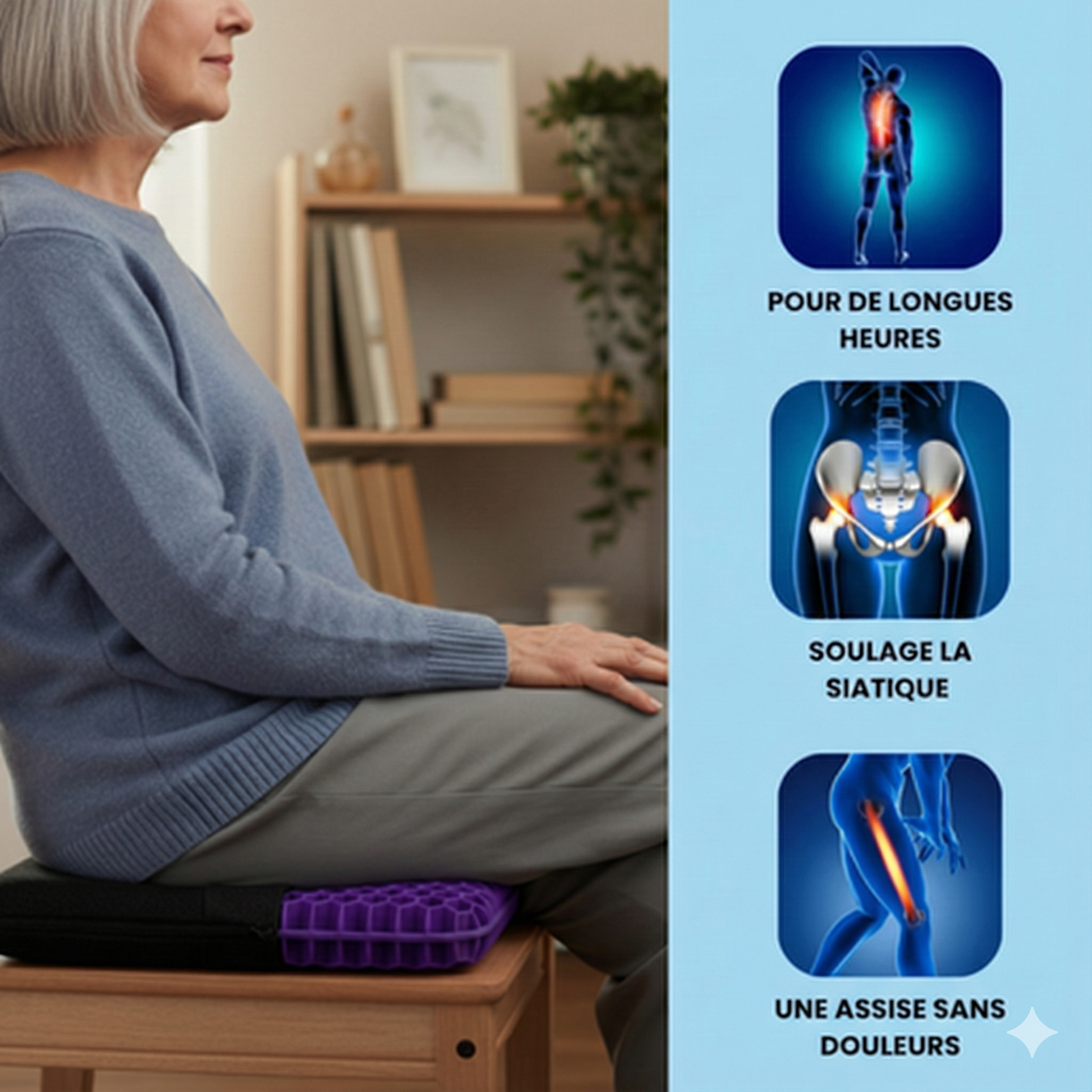 Sceptique au début... encore un truc vu sur Facebook. Mais après 3 jours assise dessus, je me lève sansraideur. Ma sciatique me réveillait chaque nuit, maintenant je dors d'une traite. Mon ostéo m'a demandé ceque j'avais changé. C'est juste ce coussin. Incroyable.